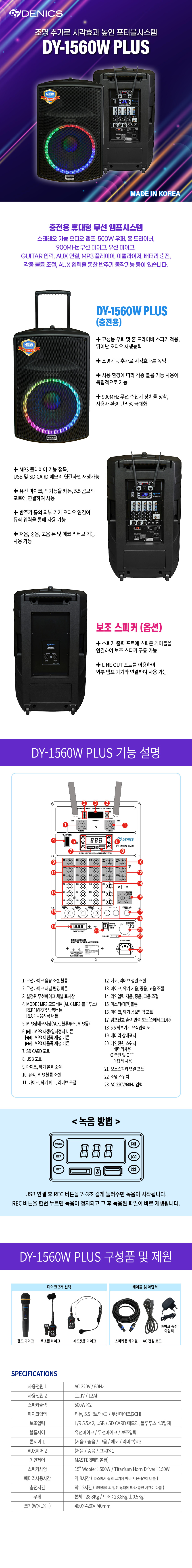 데닉스 DY-1560A PLUS 1000W(1통) [스피커추가 선택 가능] 블루투스 이동 충전식 앰프 스피커 무선마이크 풀세트 행사 집회 버스킹용